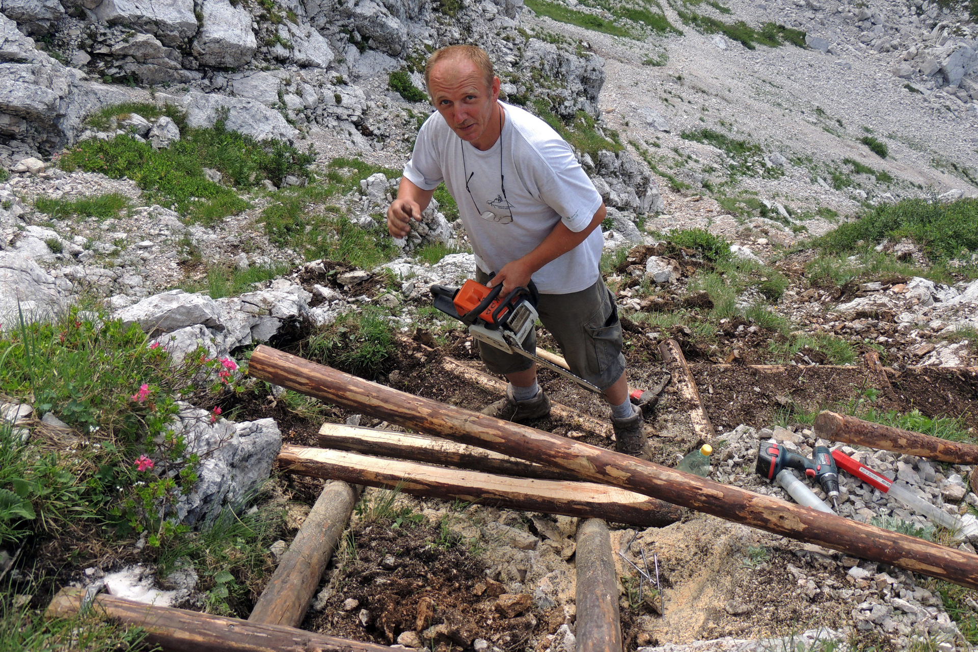 Za vse skupaj smo porabili 13 klinov, 65m macesnovih brun,42 kostanjevih količkov in 26 klinov za lesena varovala. Del poti smo nakopali oziroma odstranili skale, ter porezali ruševje.