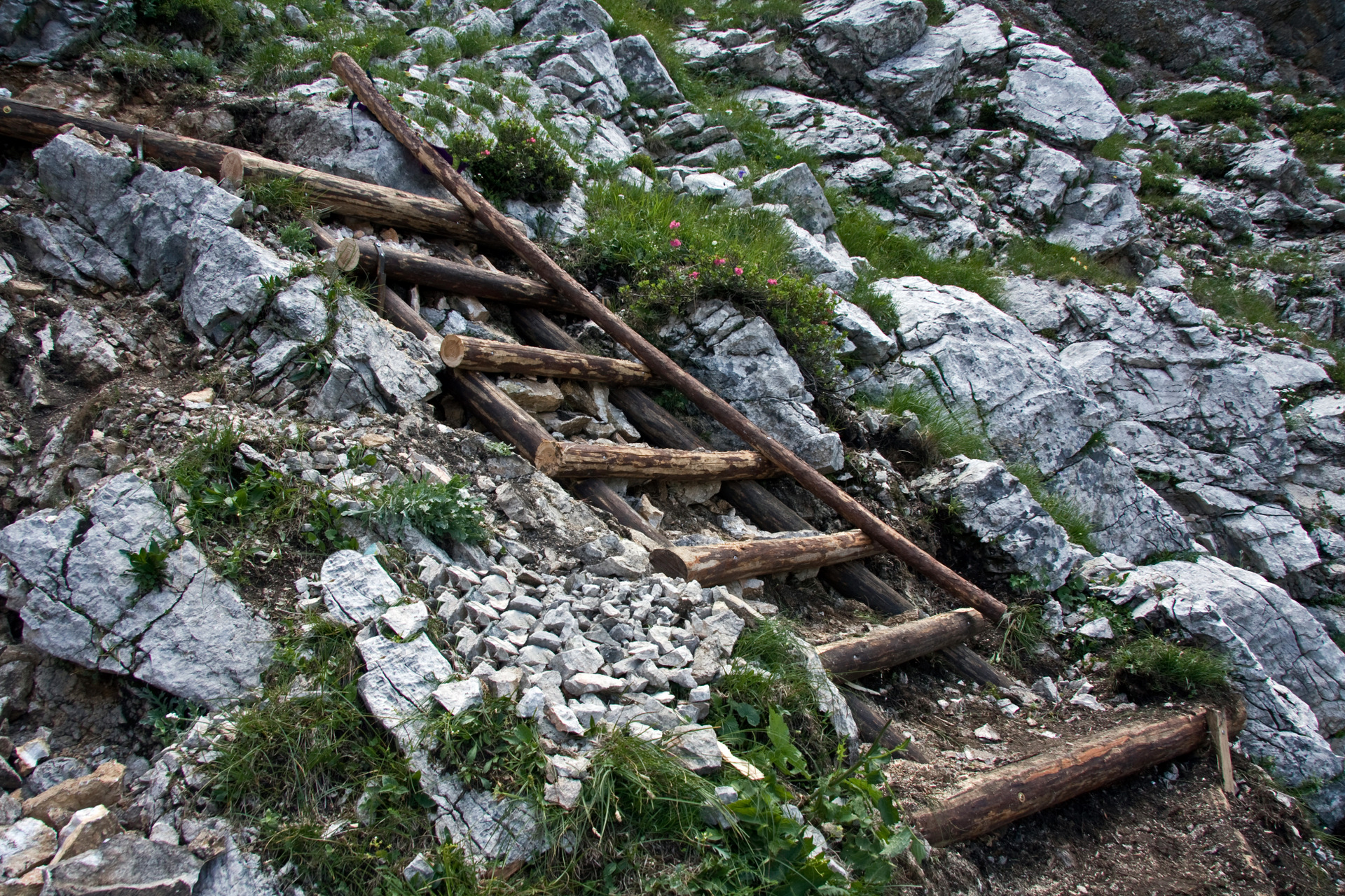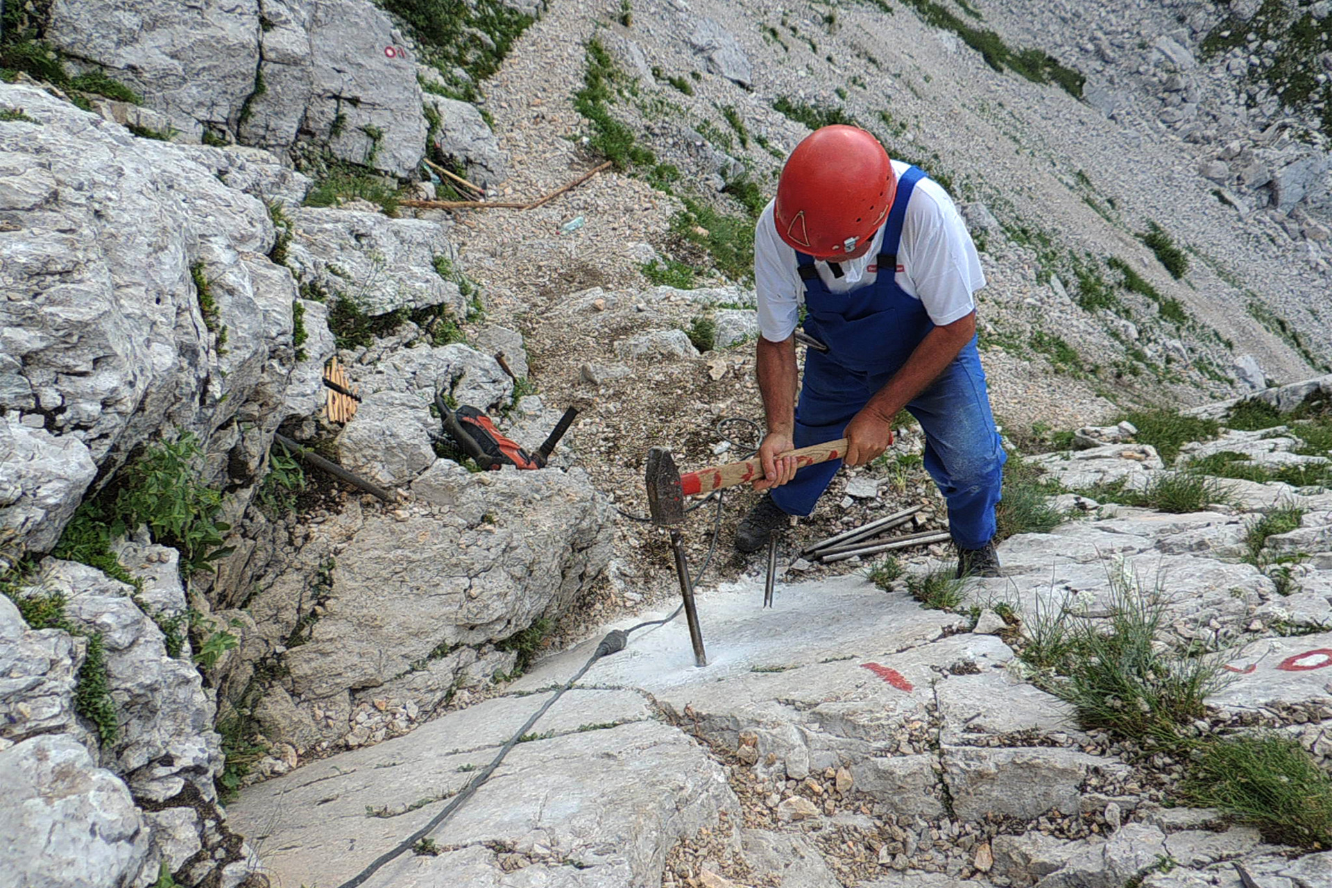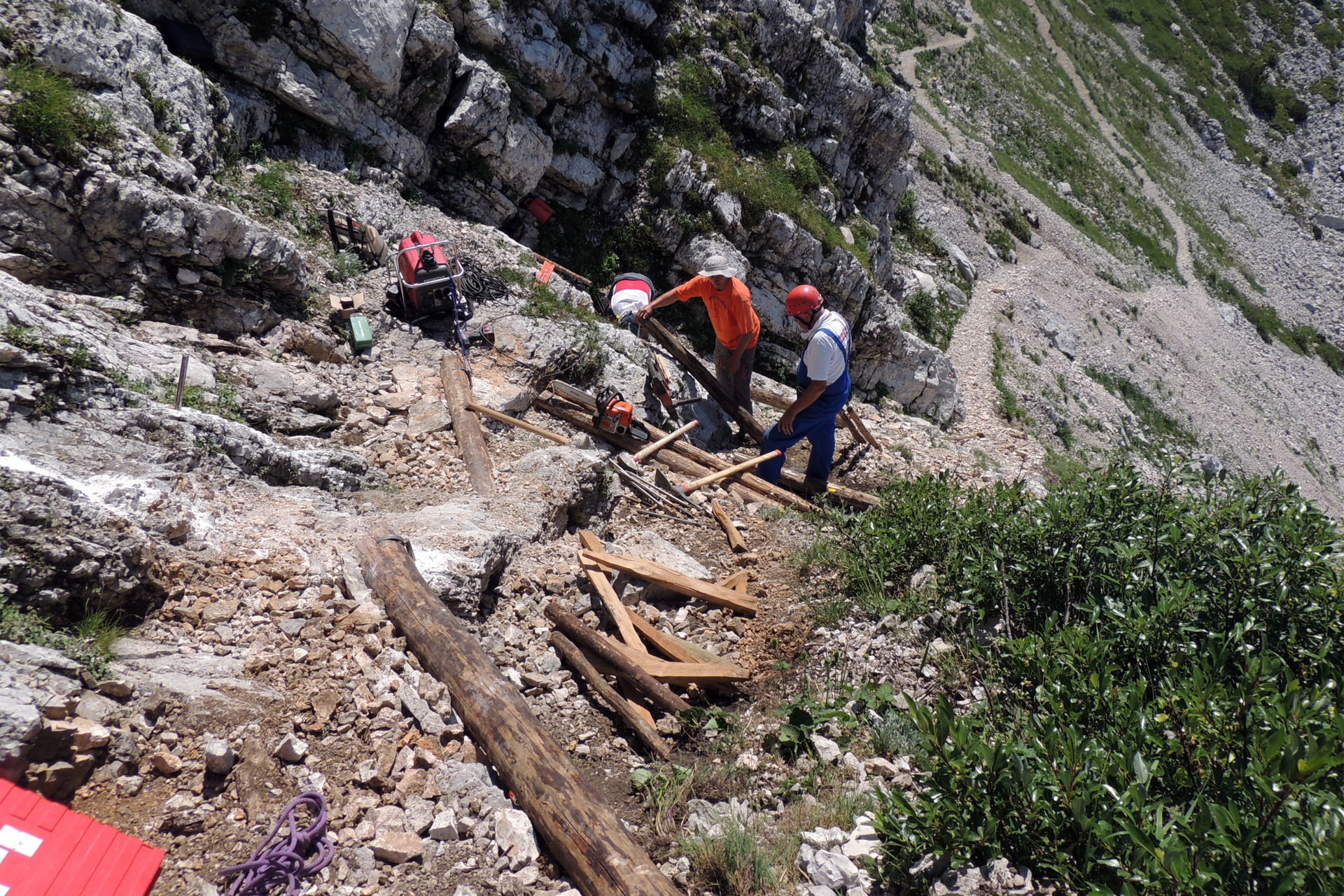 Naredili smo eno leseno lestev, več stopnic in erozijskih zaščit. Pot smo zavarovali tudi s stopnimi in oprijemalnimi klini.